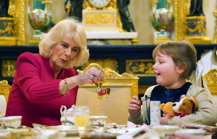 Queen Camilla presents seven-year-old Olivia Taylor from Sidcup with a corgi Christmas ornament whilst taking tea at Windsor Castle, Berkshire. The blind schoolgirl with a brain tumour sang a Christmas song and gave the Queen a handmade ring when she was invited to Windsor Castle., Credit:Jonathan Brady / Avalon