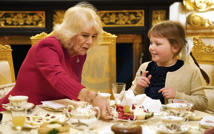 Queen Camilla takes tea with seven-year-old Olivia Taylor from Sidcup at Windsor Castle, Berkshire. The blind schoolgirl with a brain tumour sang a Christmas song and gave the Queen a handmade ring when she was invited to Windsor Castle., Credit:Jonathan Brady / Avalon