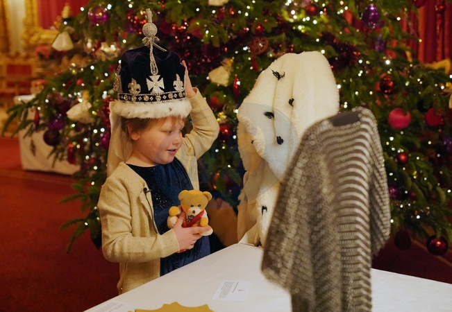 Seven-year-old Olivia Taylor from Sidcup wears a replica of the Queen Mary crown after taking tea with Queen Camilla at Windsor Castle, Berkshire. The blind schoolgirl with a brain tumour sang a Christmas song and gave the Queen a handmade ring when she was invited to Windsor Castle., Credit:Jonathan Brady / Avalon