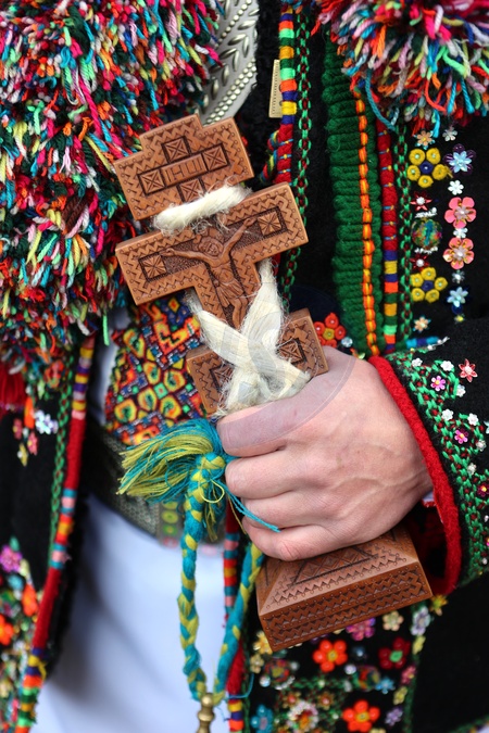 IVANO-FRANKIVSK REGION, UKRAINE - DECEMBER 25, 2023 - A wooden cross is seen in the hand of a participant of the Hutsul Koliada festivities (Christmas caroling), Kryvorivnia, Ivano-Frankivsk Region, western Ukraine, Credit:Yurii Rylchuk / Avalon