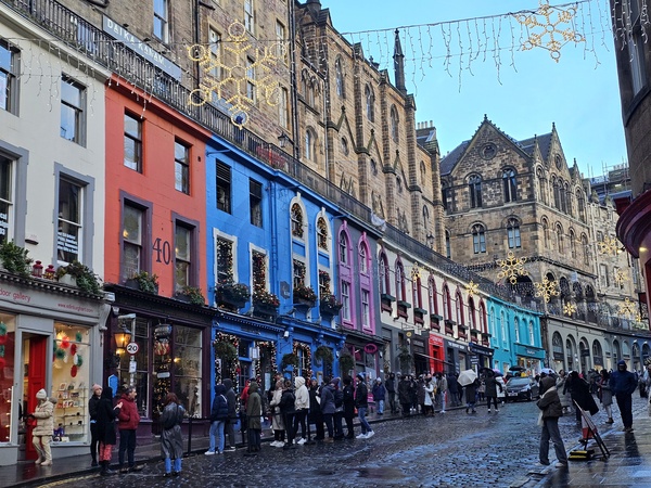 Vue de la Rue Grass Market, décorée pour Noël, à Édimbourg en Écosse, le 24 Décembre 2023. © Bertrand Rindoff / Bestimage View of the Grass Market Street, decorated for Christmas, in Edinburgh, Scotland, December 24, 2023.