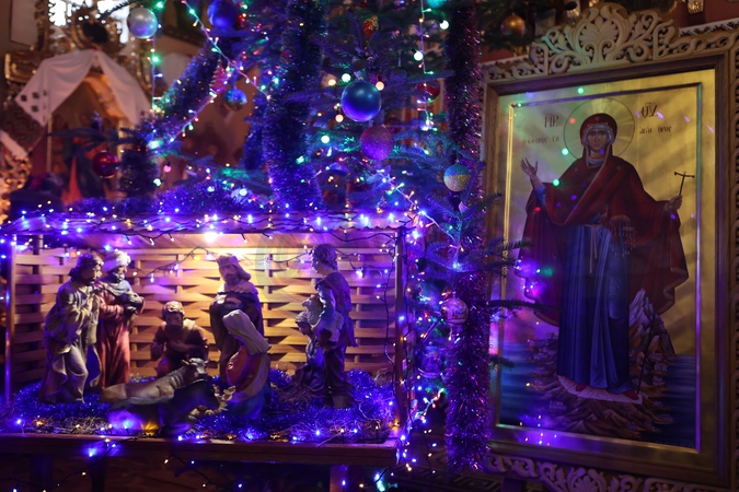 KRYVORIVNIA, UKRAINE - DECEMBER 25, 2023 - A nativity scene and an icon are seen during the divine liturgy at the Church of the Nativity of the Blessed Virgin Mary on Christmas Day, Kryvorivnia, Ivano-Frankivsk region, western Ukraine., Credit:Yurii Rylchuk / Avalon
