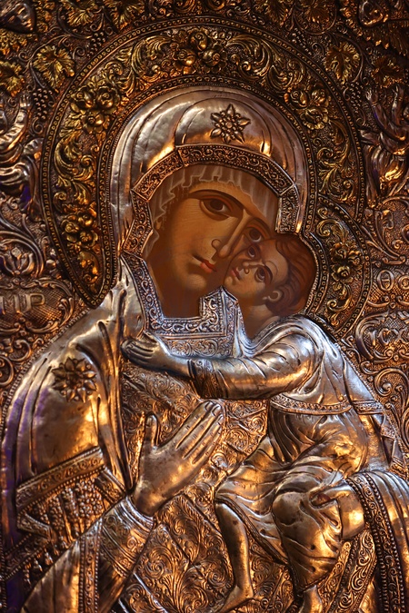 KRYVORIVNIA, UKRAINE - DECEMBER 25, 2023 - The icon of Mary and Baby Jesus are pictured during the divine liturgy at the Church of the Nativity of the Blessed Virgin Mary on Christmas Day, Kryvorivnia, Ivano-Frankivsk region, western Ukraine., Credit:Yurii Rylchuk / Avalon
