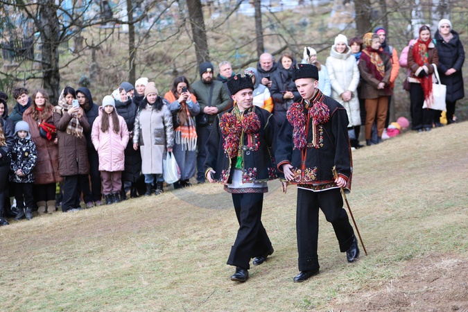 KRYVORIVNIA, UKRAINE - DECEMBER 25, 2023 - Two boys in Hutsul costumes are seen on Christmas Day, Kryvorivnia, Ivano-Frankivsk region, western Ukraine., Credit:Yurii Rylchuk / Avalon