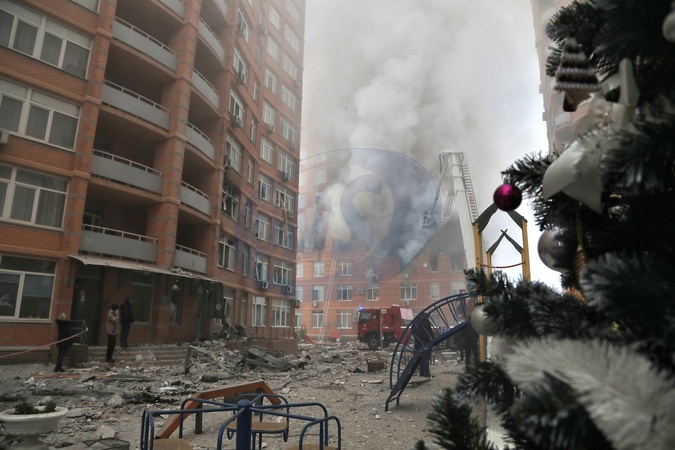 ODESA, UKRAINE - DECEMBER 29, 2023 - A spruce tree decorated for Christmas and New Year is pictured during a response effort to the massive Russian missile and drone attack at a residential complex, Odesa, southern Ukraine., Credit:Nina Liashonok / Avalon