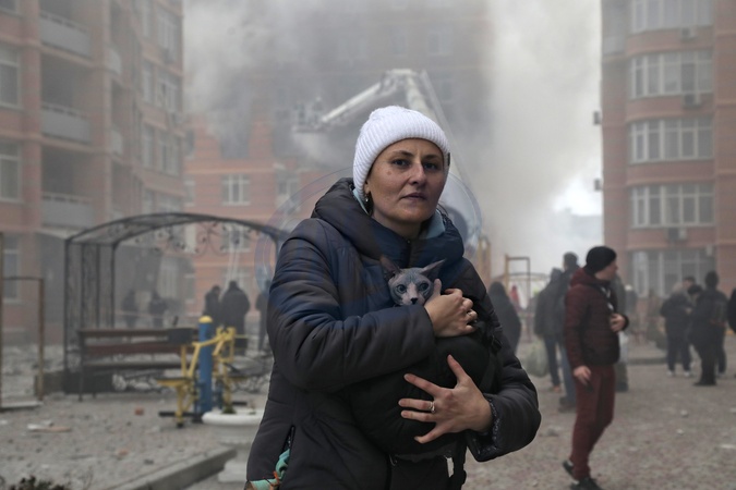ODESA, UKRAINE - DECEMBER 29, 2023 - A woman presses a cat to her chest EMTs at a residential complex affected by the massive Russian missile and drone attack, Odesa, southern Ukraine., Credit:Nina Liashonok / Avalon