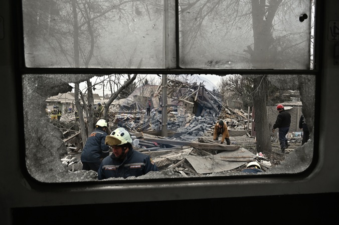 ZAPORIZHZHIA, UKRAINE - DECEMBER 29, 2023 - A broken tram window frames rescuers removing the rubble after the large-scale Russian missile and drone attack on Ukraine, Zaporizhzhia, southeastern Ukraine., Credit:Dmytro Smolienko / Avalon