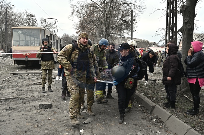 ZAPORIZHZHIA, UKRAINE - DECEMBER 29, 2023 - Law enforcers carry the stretcher with the body of a woman during a response effort to the large-scale Russian missile and drone attack on Ukraine, Zaporizhzhia, southeastern Ukraine., Credit:Dmytro Smolienko / Avalon