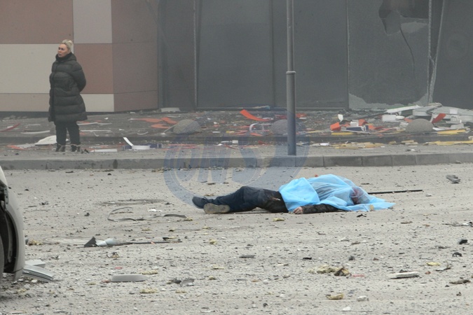 DNIPRO, UKRAINE - DECEMBER 29, 2023 - A dead body lies on the ground outside a shopping mall damaged in the massive Russian missile and drone strike on Ukraine, Dnipro, central Ukraine., Credit:Mykola Miakshykov / Avalon