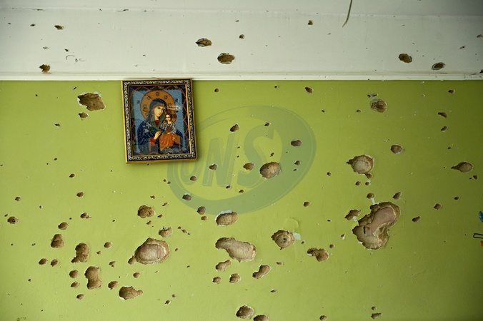 LVIV, UKRAINE - DECEMBER 29, 2023 - An icon on the wall of the lyceum damaged by a Russian missile attack, Lviv, western Ukraine, Credit:Anastasiia Smoliyenko / Avalon