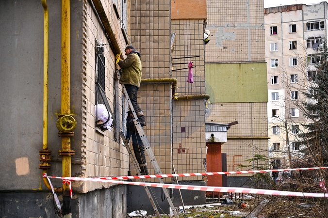 LVIV, UKRAINE - DECEMBER 29, 2023 - Men conduct the repair works at the site he shelling of a residential high-rise building by Russian troops, Lviv, western Ukraine, Credit:Anastasiia Smoliyenko / Avalon