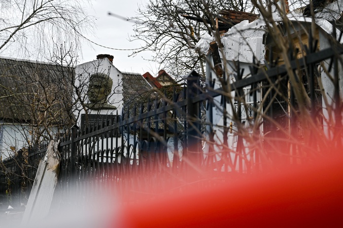 LVIV, UKRAINE - JANUARY 1, 2024 - The bas-relief commemorating Roman Shukhevych, the military leader of the Ukrainian Insurgent Army (UPA), is seen on the premises of the museum ruined in the Russian drone attack in Bilohorshcha on the outskirts of Lviv, western Ukraine. According to preliminary reports, 10 Russian Shahed drones attacked the Lviv community on New Year's Eve. The falling debris of a Russian drone caused a fire at the Shukhevych Museum., Credit:Anastasiia Smolienko / Avalon