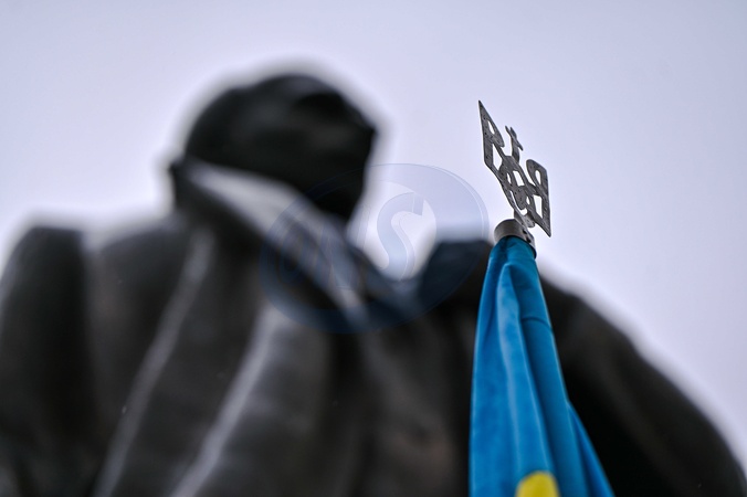 LVIV, UKRAINE - JANUARY 1, 2024 - The Ukrainian coat of arms crowns the shaft at the monument to Stepan Bandera on the 115th birthday anniversary of the leader of the Organization of Ukrainian Nationalists (OUN-B), Lviv, western Ukraine., Credit:Anastasiia Smolienko / Avalon