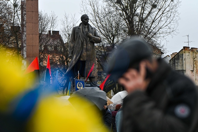 LVIV, UKRAINE - JANUARY 1, 2024 - The monument to Stepan Bandera is pictured during the prayer service for Ukraine held on the 115th birthday anniversary of the leader of the Organization of Ukrainian Nationalists (OUN-B), Lviv, western Ukraine., Credit:Anastasiia Smolienko / Avalon