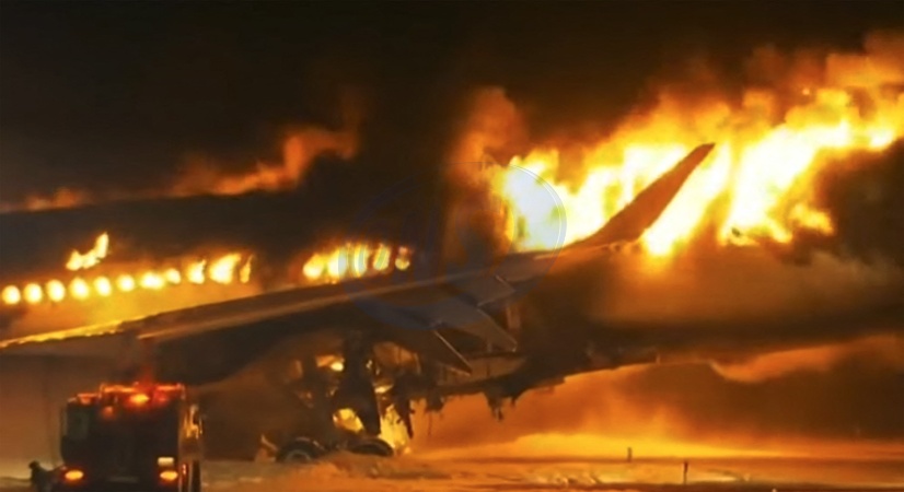 Samolot pasażerski zapala się po zderzeniu na lotnisku w Tokio
