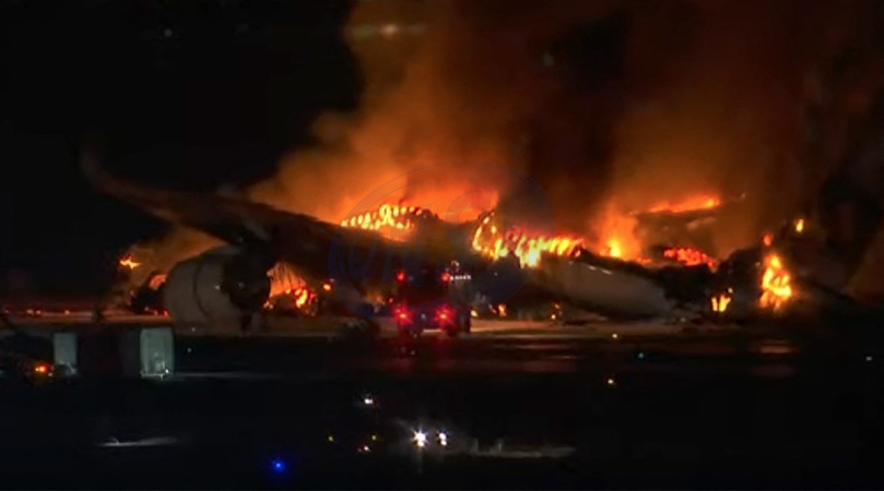 Samolot pasażerski zapala się po zderzeniu na lotnisku w Tokio