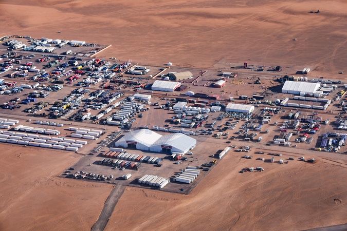 Widok z lotu ptaka na biwak Dakar 2024 podczas kontroli administracyjno-technicznych w Al-Ula w Arabii Saudyjskiej