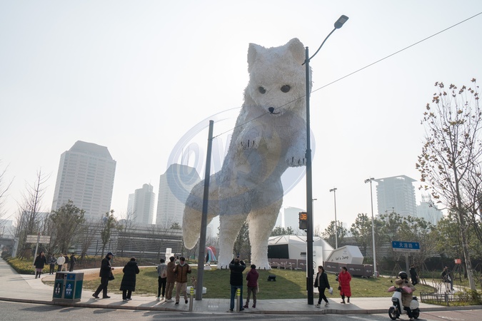 A view of the giant art installation named "Let's jump!" created by Holland artist Florentijn Hofman in Shanghai, China Thursday, Jan. 04, 2024. The installation depicting an Arctic fox delights with its glowing eyes and fluttering paper-like fur., Credit:WANG GANG / Avalon