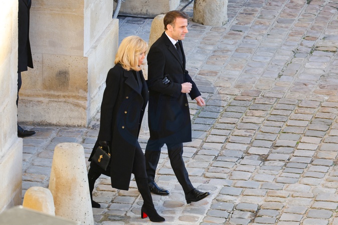 Le président Emmanuel Macron et sa femme Brigitte Macron - Hommage national à M. Jacques Delors, dans la cour d'honneur de l'Hôtel national des Invalides à Paris le 5 janvier 2024. © Dominique Jacovides / Bestimage National tribute to Jacques Delors, in the main courtyard of the Hôtel national des Invalides in Paris on 5 January 2024