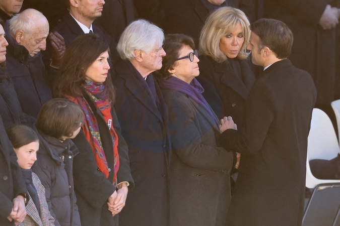 Le président Emmanuel Macron, Martine Aubry, son mari Jean-Louis Brochen, Brigitte Macron - Hommage national à M. Jacques Delors, dans la cour d'honneur de l'Hôtel national des Invalides à Paris le 5 janvier 2024. © Dominique Jacovides / Bestimage National tribute to Jacques Delors, in the main courtyard of the Hôtel national des Invalides in Paris on 5 January 2024