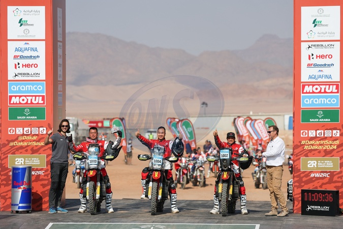 1003 SU Wenmin (chn), Artic Leopard Factory Racing, Arctic Leopard, Moto, Dakar Future Mission 1000, 1004 CAI GANG Jun (chn), Artic Leopard Factory Racing, Arctic Leopard, Moto, Dakar Future Mission 1000, 1002 JOBARD Willy (fra), Artic Leopard Factory Racing, Arctic Leopard, Moto, Dakar Future Mission 1000, start podium, during the Al Ula Start Camp Ceremony of the Dakar 2024 on January 4, 2024 in Al-Ula, Saudi Arabia. © Antonin Vincent/DPPI/Panoramic/Bestimage