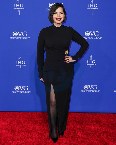 PALM SPRINGS, RIVERSIDE COUNTY, CALIFORNIA, USA - JANUARY 04: America Ferrera wearing a Lela Rose dress arrives at the 35th Annual Palm Springs International Film Festival Film Awards held at the Palm Springs Convention Center on January 4, 2024 in Palm Springs, Riverside County, California, United States., Credit:Xavier Collin / Avalon