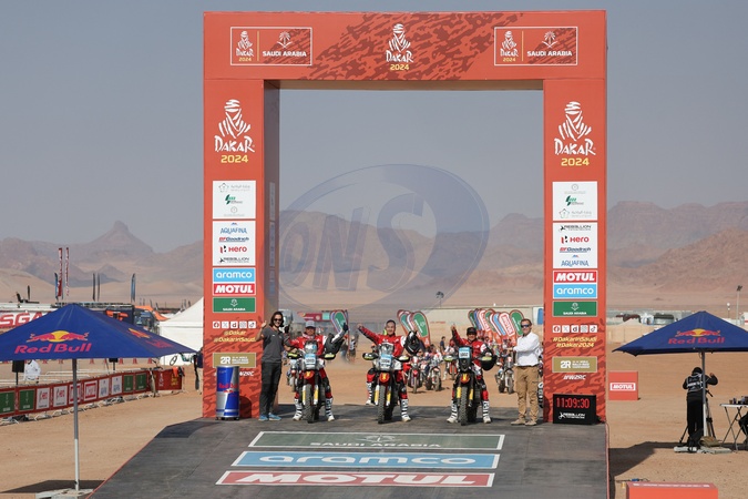 1003 SU Wenmin (chn), Artic Leopard Factory Racing, Arctic Leopard, Moto, Dakar Future Mission 1000, 1004 CAI GANG Jun (chn), Artic Leopard Factory Racing, Arctic Leopard, Moto, Dakar Future Mission 1000, 1002 JOBARD Willy (fra), Artic Leopard Factory Racing, Arctic Leopard, Moto, Dakar Future Mission 1000, start podium, during the Al Ula Start Camp Ceremony of the Dakar 2024 on January 4, 2024 in Al-Ula, Saudi Arabia. © Antonin Vincent/DPPI/Panoramic/Bestimage