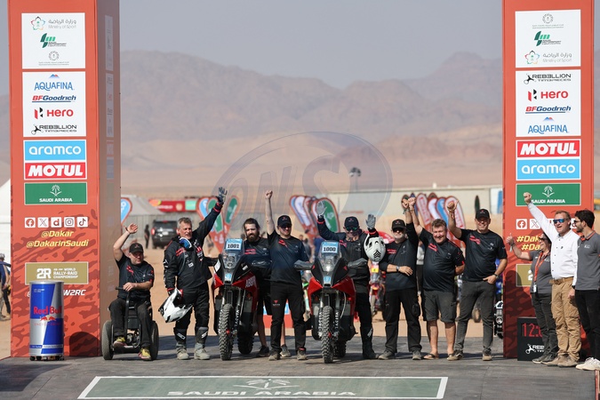 1000 ESPINASSE Sylvain (fra), Tacita Fromula Corsa, Tacita, Moto, Dakar Future Mission 1000, 1001 POLLI Oscar (ita), Tacita Fromula Corsa, Tacita, Moto, Dakar Future Mission 1000, start podium, during the Al Ula Start Camp Ceremony of the Dakar 2024 on January 4, 2024 in Al-Ula, Saudi Arabia. © Antonin Vincent/DPPI/Panoramic/Bestimage