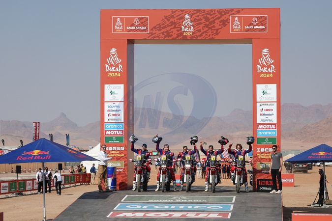 07 QUINTANILLA Pablo (chl), Monster Energy Honda Team, Honda, Moto, FIM W2RC, 09 BRABEC Ricky (usa), Monster Energy Honda Team, Honda, Moto, FIM W2RC, 10 HOWES Skyler (usa), Monster Energy Honda Team, Honda, Moto, FIM W2RC, 11 CORNEJO FLORIMO José Ignacio (chl), Monster Energy Honda Team, Honda, Moto, FIM W2RC, 42 VAN BEVEREN Adrien (fra), Monster Energy Honda Team, Honda, Moto, FIM W2RC, start podium, during the Al Ula Start Camp Ceremony of the Dakar 2024 on January 4, 2024 in Al-Ula, Saudi Arabia. © Antonin Vincent/DPPI/Panoramic/Bestimage