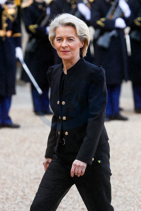Ursula von der Leyen, présidente de la commission européenne - Dans le cadre de l'hommage national à M. Jacques Delors, le Président de la République reçoit pour un déjeuner les chefs d'Etat et de gouvernement européens et les représentants des institutions européennes au palais présidentiel de l'Elysée à Paris, France, le 5 janvier 2024. Delors, figure de la création de l'euro (€), est décédé le 27 décembre 2023 à l'âge de 98 ans.© Christophe Clovis/Bestimage Lunch following a national tribute ceremony for late French minister and European Union Commission president Jacques Delors at the Elysee palace in Paris, France, on January 5, 2024. Delors, a figure in the creation of the euro (€), died on December 27, 2023 aged 98.