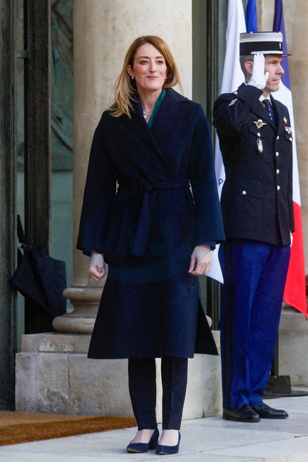 Roberta Metsola, présidente du Parlement européen - Dans le cadre de l'hommage national à M. Jacques Delors, le Président de la République reçoit pour un déjeuner les chefs d'Etat et de gouvernement européens et les représentants des institutions européennes au palais présidentiel de l'Elysée à Paris, France, le 5 janvier 2024. Delors, figure de la création de l'euro (€), est décédé le 27 décembre 2023 à l'âge de 98 ans.© Christophe Clovis/Bestimage Lunch following a national tribute ceremony for late French minister and European Union Commission president Jacques Delors at the Elysee palace in Paris, France, on January 5, 2024. Delors, a figure in the creation of the euro (€), died on December 27, 2023 aged 98.
