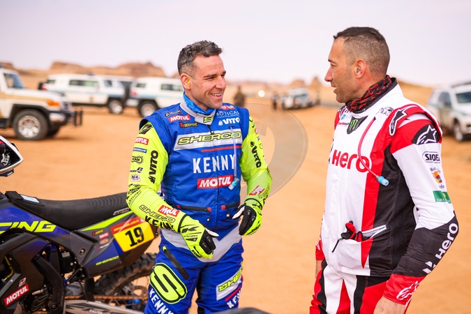 19 GONCALVES Rui (art), Sherco Factory, Sherco, Motul, Moto, RODRIGUES Joaquim (prt), Hero Motorsports Team Rally, Hero, Motul, Moto, FIM W2RC, portrait, during the Prologue of the Dakar 2024 on January 5, 2024 in Al-Ula, Saudi Arabia. © Florent Gooden/DPPI/Panoramic/Bestimage