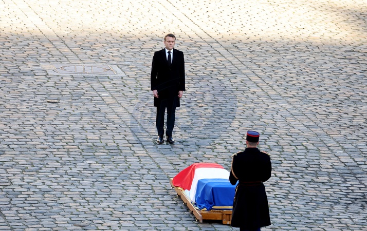 Le Président Emmanuel Macron Hommage national à M. Jacques Delors, dans la cour d'honneur de l'Hôtel national des Invalides à Paris, France, le 5 janvier 2024. © Dominique Jacovides/Bestimage National tribute to Jacques Delors, in the main courtyard of the Hôtel national des Invalides in Paris, France, on January 5th, 2024.