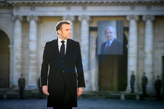 Emmanuel Macron, président de la République française - Hommage national à M. Jacques Delors, dans la cour d'honneur de l'Hôtel national des Invalides à Paris, France, le 5 janvier 2024. © Eric Tschaen/Pool/Bestimage National tribute to Jacques Delors, in the main courtyard of the Hôtel national des Invalides in Paris, France, on January 5th, 2024.