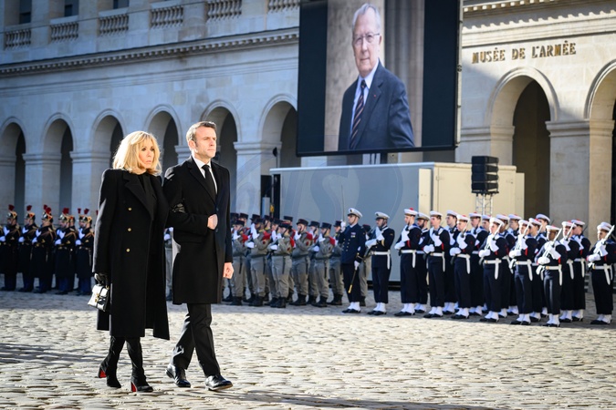 Emmanuel Macron, président de la Republique et sa femme la Première Dame Brigitte Macron - Hommage national à M. Jacques Delors, dans la cour d'honneur de l'Hôtel national des Invalides à Paris, France, le 5 janvier 2024. © Eric Tschaen/Pool/Bestimage National tribute to Jacques Delors, in the main courtyard of the Hôtel national des Invalides in Paris, France, on January 5th, 2024.