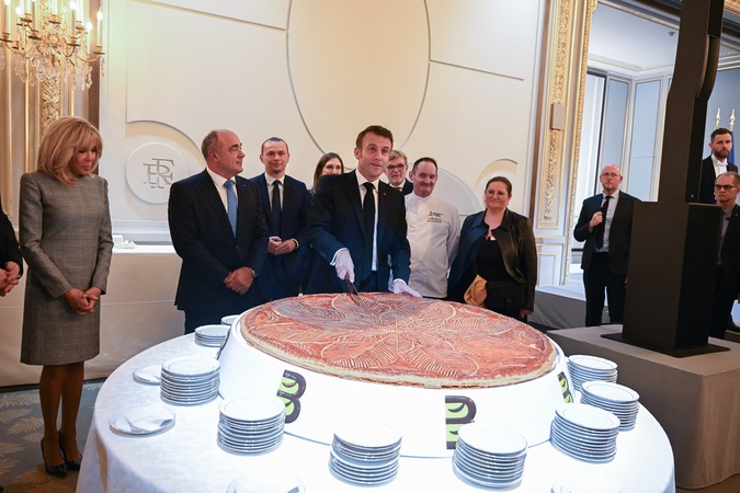 Prezydent Emmanuel Macron i jego żona Pierwsza Dama Brigitte Macron świętują Święto Trzech Króli tradycyjną galette des rois w Pałacu Elizejskim w Paryżu