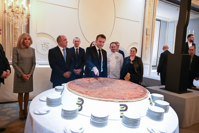 Prezydent Emmanuel Macron i jego żona Pierwsza Dama Brigitte Macron świętują Święto Trzech Króli tradycyjną galette des rois w Pałacu Elizejskim w Paryżu