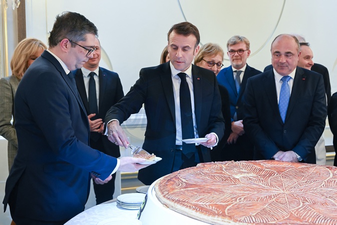 Prezydent Emmanuel Macron i jego żona Pierwsza Dama Brigitte Macron świętują Święto Trzech Króli tradycyjną galette des rois w Pałacu Elizejskim w Paryżu