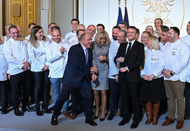 Prezydent Emmanuel Macron i jego żona Pierwsza Dama Brigitte Macron świętują Święto Trzech Króli tradycyjną galette des rois w Pałacu Elizejskim w Paryżu