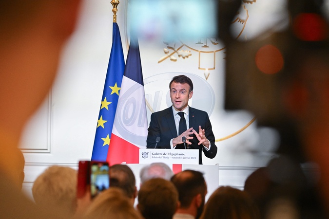 Emmanuel Macron. - French President addresses members of the French bakery and pastry federation during the traditional Epiphany cake ceremony at the presidential Elysee Palace in Paris, France, on January 5, 2024. © Jacques Witt/Pool/Bestimage
