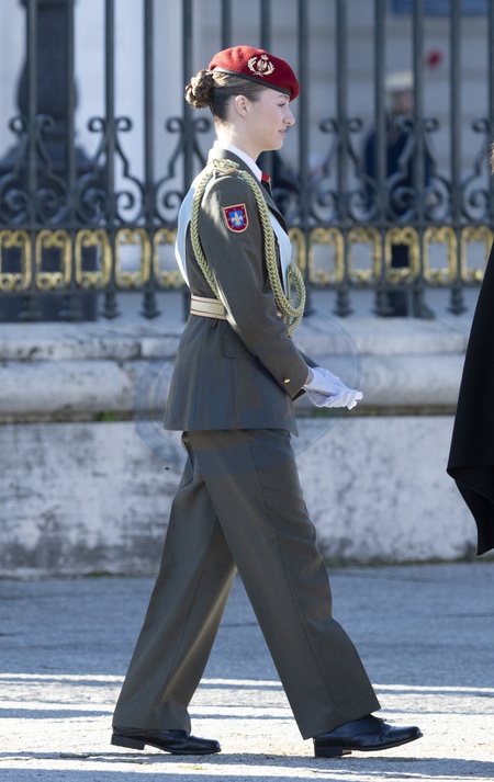 Król Felipe VI, królowa Hiszpanii Letizia i księżniczka Leonor biorą udział w ceremonii wojskowej „Pascua Militar” w Pałacu Królewskim w Madrycie