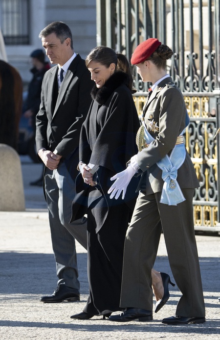 Le roi Felipe VI, la reine Letizia d'Espagne et la princesse Leonor assistent à la cérémonie militaire "Pascua Militar" au Palais Royal de Madrid