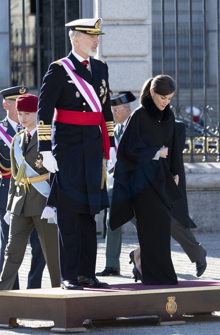 Le roi Felipe VI, la reine Letizia d'Espagne et la princesse Leonor assistent à la cérémonie militaire "Pascua Militar" au Palais Royal de Madrid