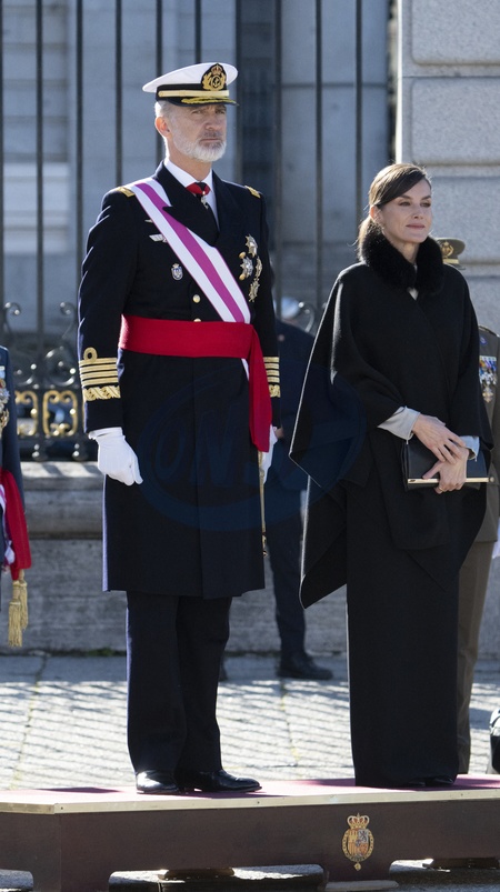 Le roi Felipe VI, la reine Letizia d'Espagne et la princesse Leonor assistent à la cérémonie militaire "Pascua Militar" au Palais Royal de Madrid