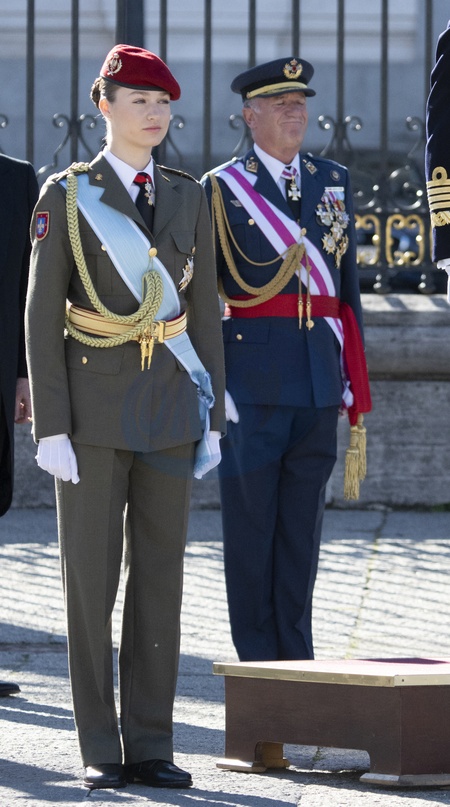 Król Felipe VI, królowa Hiszpanii Letizia i księżniczka Leonor biorą udział w ceremonii wojskowej „Pascua Militar” w Pałacu Królewskim w Madrycie