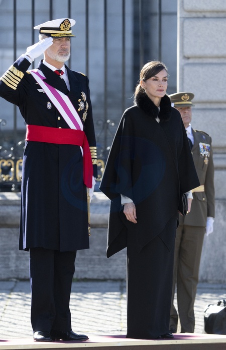 Le roi Felipe VI, la reine Letizia d'Espagne et la princesse Leonor assistent à la cérémonie militaire "Pascua Militar" au Palais Royal de Madrid