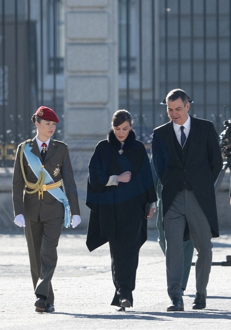 Le roi Felipe VI, la reine Letizia d'Espagne et la princesse Leonor assistent à la cérémonie militaire "Pascua Militar" au Palais Royal de Madrid