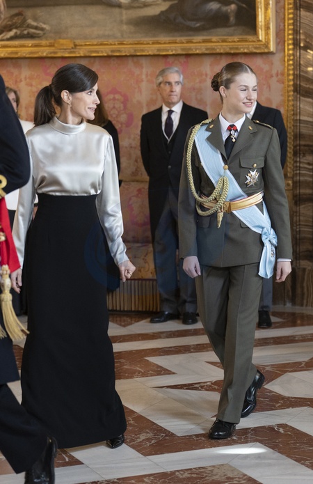 Le roi Felipe VI, la reine Letizia d'Espagne et la princesse Leonor assistent à la cérémonie militaire "Pascua Militar" au Palais Royal de Madrid