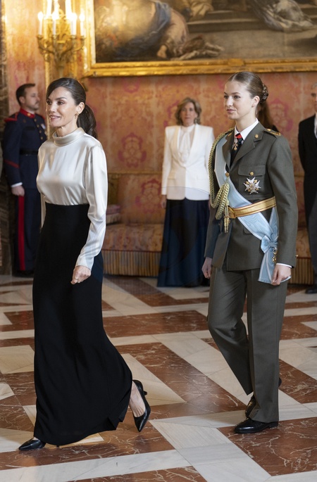 Le roi Felipe VI, la reine Letizia d'Espagne et la princesse Leonor assistent à la cérémonie militaire "Pascua Militar" au Palais Royal de Madrid
