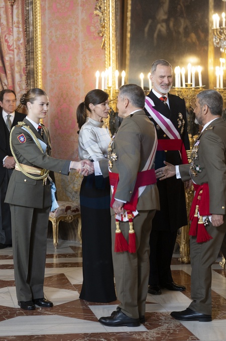Le roi Felipe VI, la reine Letizia d'Espagne et la princesse Leonor lors de la réception militaire de Pâques au Palais Royal, le 6 janvier 2024 à Madrid, Espagne, le 6 janvier 2024. King Felipe VI, Queen Letizia, Crownprincess Leonor - Spanish Royals host the traditional annual Military Pasques parade and reception at The Royal Palace in Madrid. January 6, 2024.